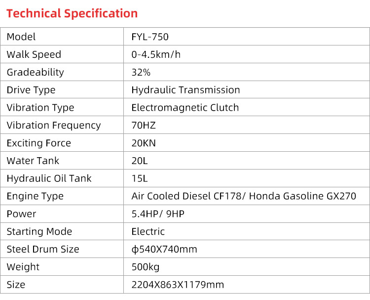 FYL-750 road compactor roller is vibratory type small road roller,510kg weight,2 ton compaction force,full hydraulic transmission,mainly used for compaction soil,asphalt surface,gravel,sand,etc.