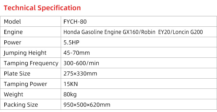 Mainly used for tamping of engineering foundation and groove backfill in the field of road, public project, telecom, gas, water delivery, railway and so on.