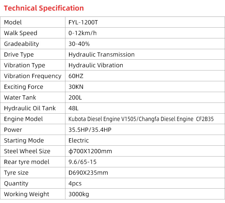 FYL-1200T Vibratory Compactor Roller is used for compaction of asphalt surface, compaction of gravel, sand and other projects.It is vibratory roller, applied to mend and maintain various roads, expressway, roadside walk,parking area, sports ground and garden lawn.