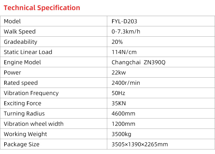 FYL-D203 is is 3ton vibratory road roller with two rubber tyres,this roller adopts China famous brand Changchai diesel engine, the front drum width is 1200mm, the vibration capacity is 3.2ton.