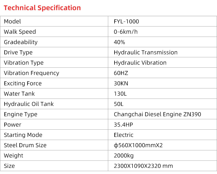 FYL-1000 is ride on double drum hydraulic vibration road roller used to compaction of asphalt, compaction of non-cohesive and cohesive soil and compaction of stabilized soils. It is used primarily for small-scale compaction work such as pavements, cycle paths, small roads and small parking areas places that need compaction but are difficult to reach with a large roller.