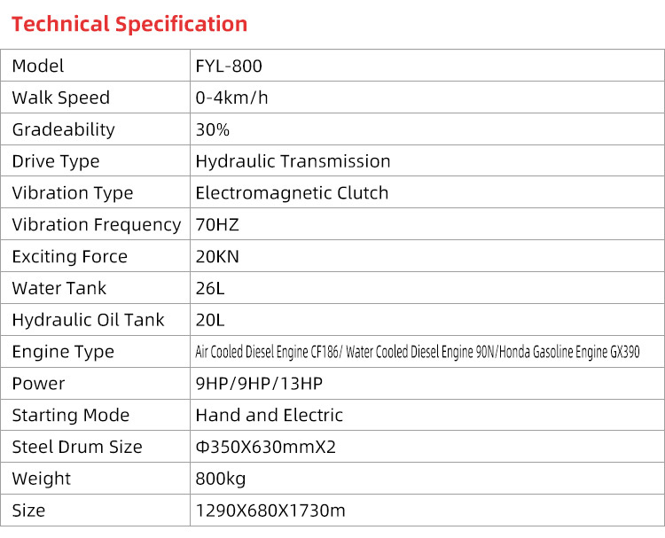 FYL-800 Road Roller All-hydraulic transmission system Simple and flexible operation can easily control the travel direction, speed and vibration status of the roller. Equipped with adjustable folding handle, it can let the operator find a comfortable operating position to reduce labor intensity, and it is easy to be transported and stored after folding.