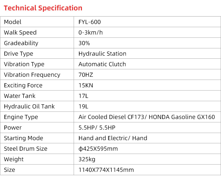 FYL-600 is 325kg Mini Road Roller, mainly used for narrow place compaction, soil and asphalt pavement; road maintenance and construction. Such as highway construction of culvert, channel into the edge, corner of the compaction of asphalt concrete, bridge abutment backfill structures, large roller compaction cannot work area.