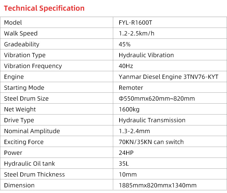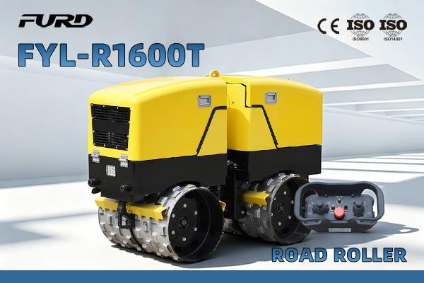 FYL-R1600T remote control road roller with weight of 1600kg, adopts full hydraulic transmission, infinitely variable speed, double drums hydraulic motor driving, articulated hydraulic steering, front drum vibrating or double drums vibrating can choose, the vibration weight is 2.5 ton. Mainly used for trench compaction and dangerous project.