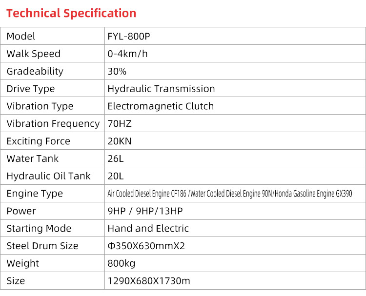 FYL-800 is 800kg hydraulic steering road roller compactor, adopt heavy-duty variable displacement piston pump, hydraulic motor driven variable speed walking, electromagnetic clutch vibration.