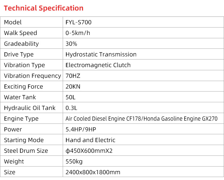 FYL-S700 is ride on double drum vibration roller, variable speed. Hydraulic motor driving, mechanical turning. The drum vibrating by electromagnetic clutch, easy to operate. This small road roller has light weight and compact design, mainly used for narrow area compaction and road repair project.