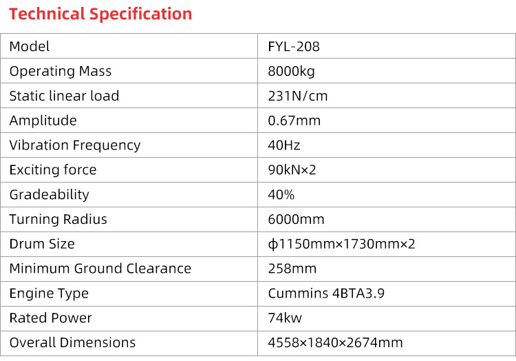 Dual Drum Design Road Roller: Ensures even compaction and reduces wear. High Operating Efficiency: Achieves quick and effective compaction. 1 Year Warranty: Peace of mind for long-term use. 90KN*2/69KN*2 Vibration Force: Provides powerful compaction force. 40% Gradeability: Capable of working on steep terrains.