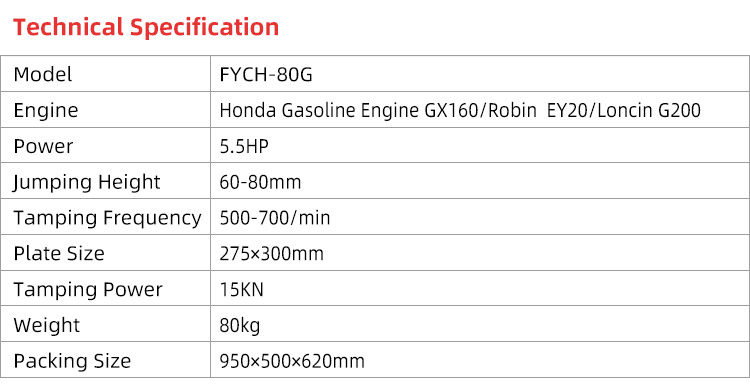 FYCH-80G is suitable for tamping engineering foundation, curb and asphalt pavement when constructing road surface,street,building,canal and bridge in the fields of highway, municipal administration, construction and water conservancy.